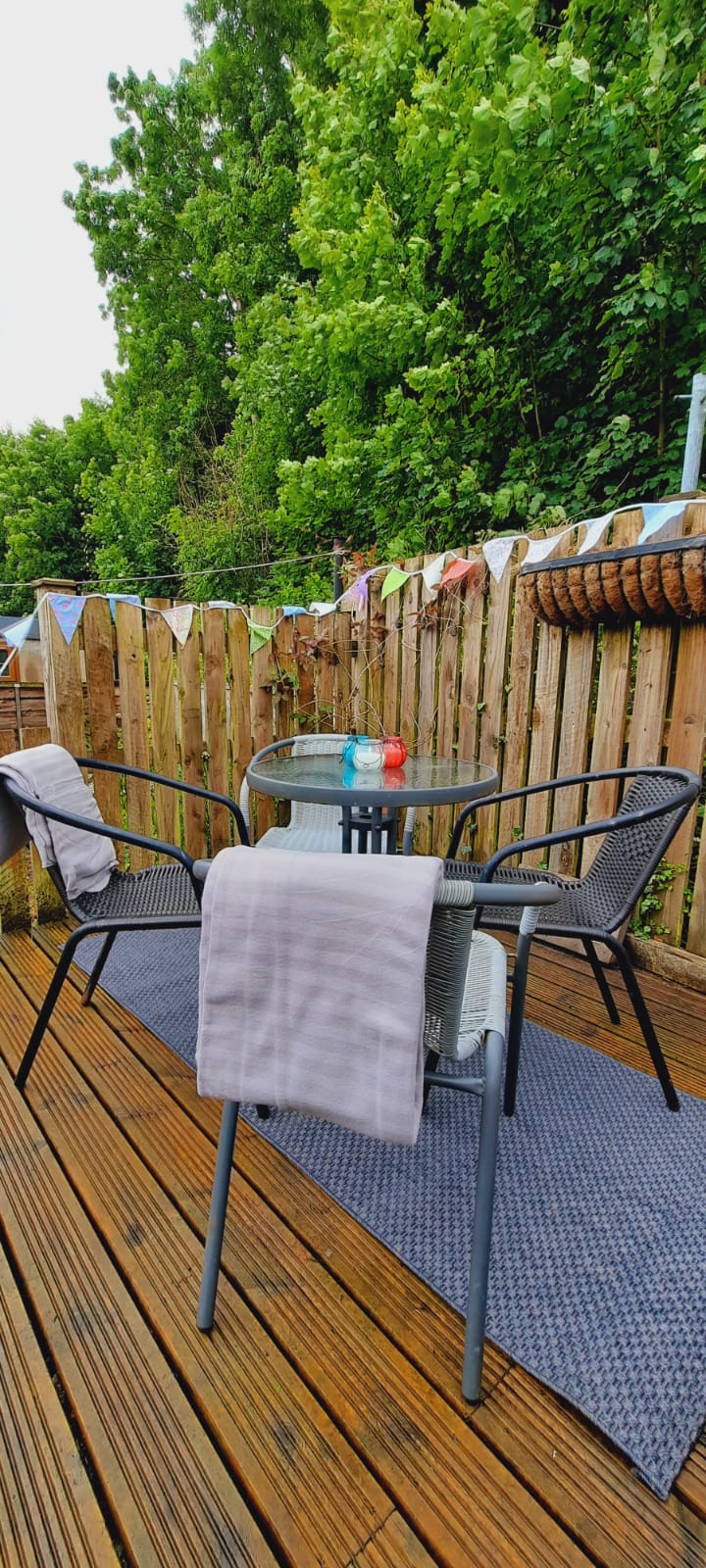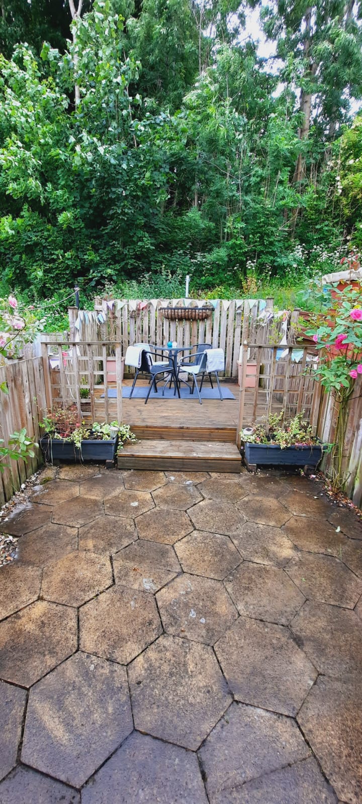 It is just two steps straight into an enclosed fenced and gated garden with a paved area and a raised decking with seating for four people.